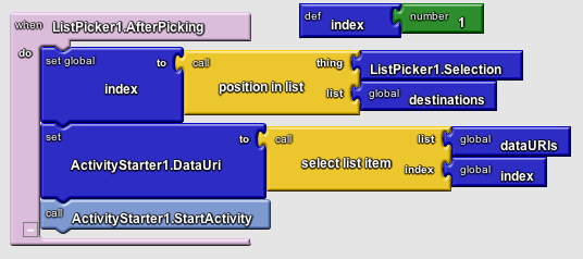 In Part I of this tutorial, the ListPicker.AfterPicking Behavior set the DataUri to the concatenation of "geo:0,0?q=" and the destination the user chose from the list, e.g., Tour Eiffel. In this second part, the AfterPicking behavior must be more sophisticated. Specifically, when the user chooses one of the items from the ListPicker, you need to know the index of the choice. You can then use that index to select the correct DataUri from the dataURIs list.
